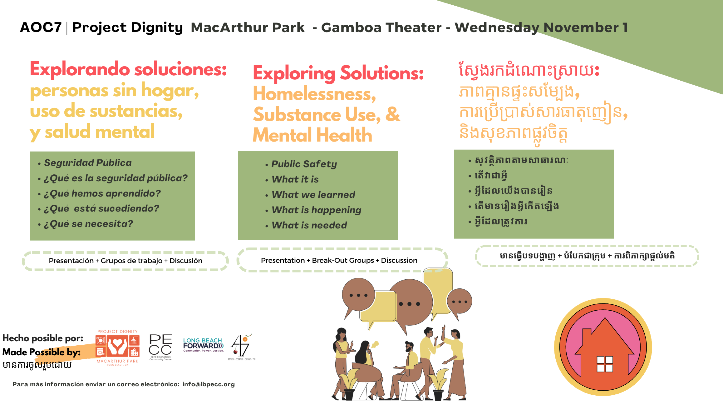 In November 2023, AOC7 (now Climb Central LB) and PECC presented a workshop for the housed community learn about homelessness. Topics covered included mental health, public safety, substance use, and the processes, including estimated days/weeks/months, for a person or family to receive social services like housing, mental health treatment, food/water, medical assistance, and other services. In three languages: Spanish, Khmer, and English.