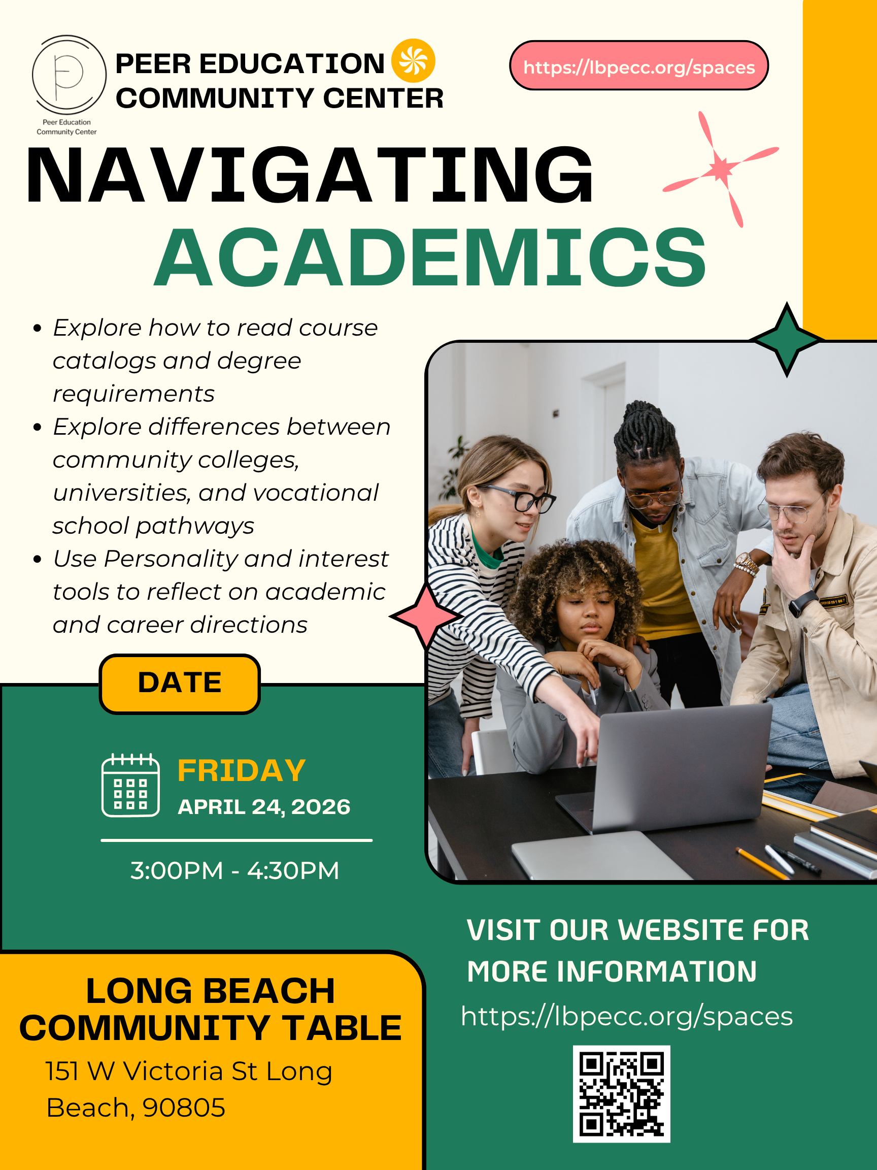 Join a peer-to-peer workshop for Navigating Academia. Hosted by a current CSULB senior, she will break down the path towards that finish line, finding the resources needed on and off campus, and share tools that help define career directions.